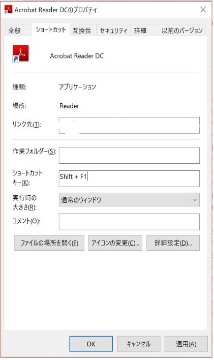 キー設定したいショートカットのプロパティを開いて、